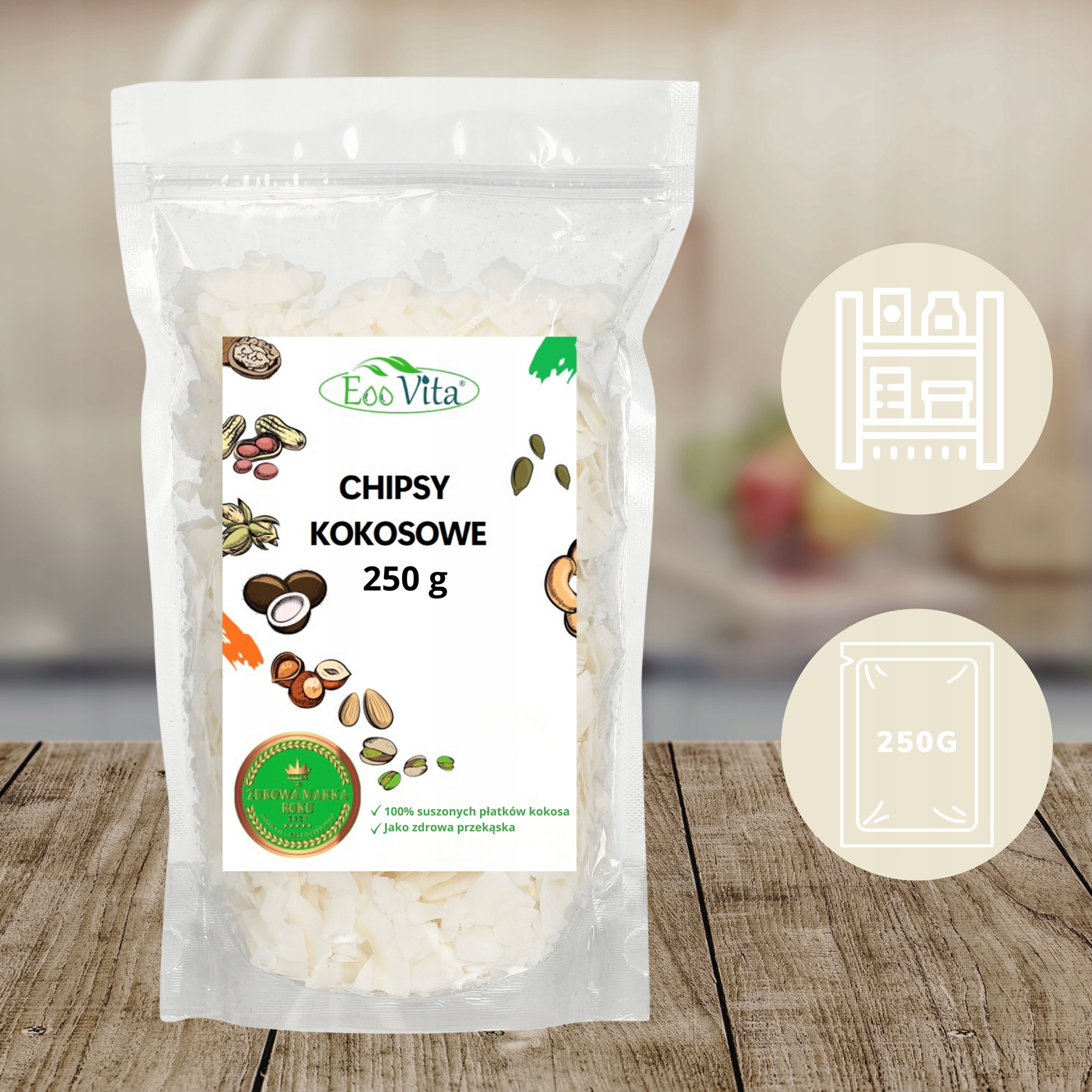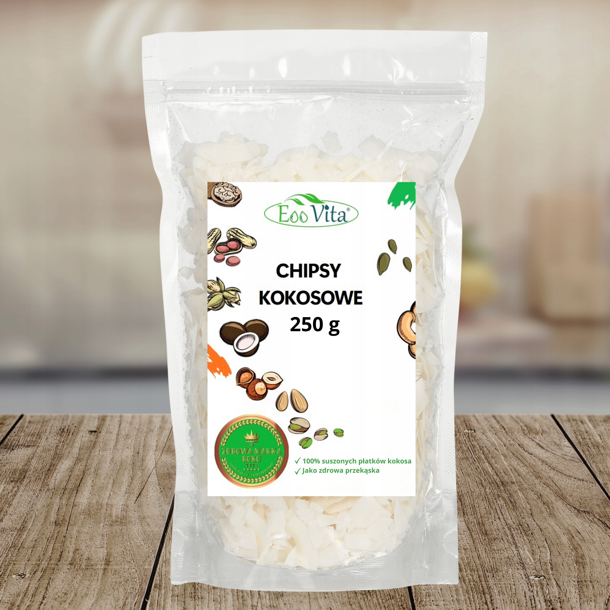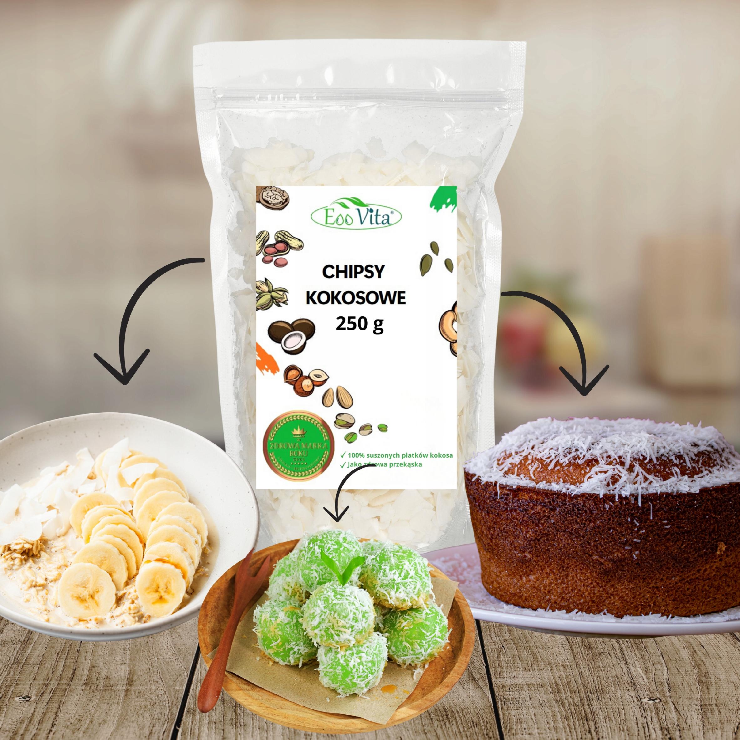 Chipsy kokosowe mają postać cienkich, lekkich płatków o jednolitej, chrupiącej konsystencji. Jasna barwa wynika z wykorzystania wysokiej jakości miąższu kokosowego. Dzięki takiej formie łatwo łączy się z innymi składnikami – dobrze rozprowadza się w deserach, wypiekach oraz różnego rodzaju mieszankach, nie tworząc grudek ani nie dominując smaku gotowej potrawy. Subtelny, kokosowy aromat nadaje daniom delikatną egzotyczną nutę. Chipsy sprawdzą się zarówno jako dodatek, przekąska, jak i uzupełnienie wielu przepisów kuchennych – w wersji słodkiej i wytrawnej.