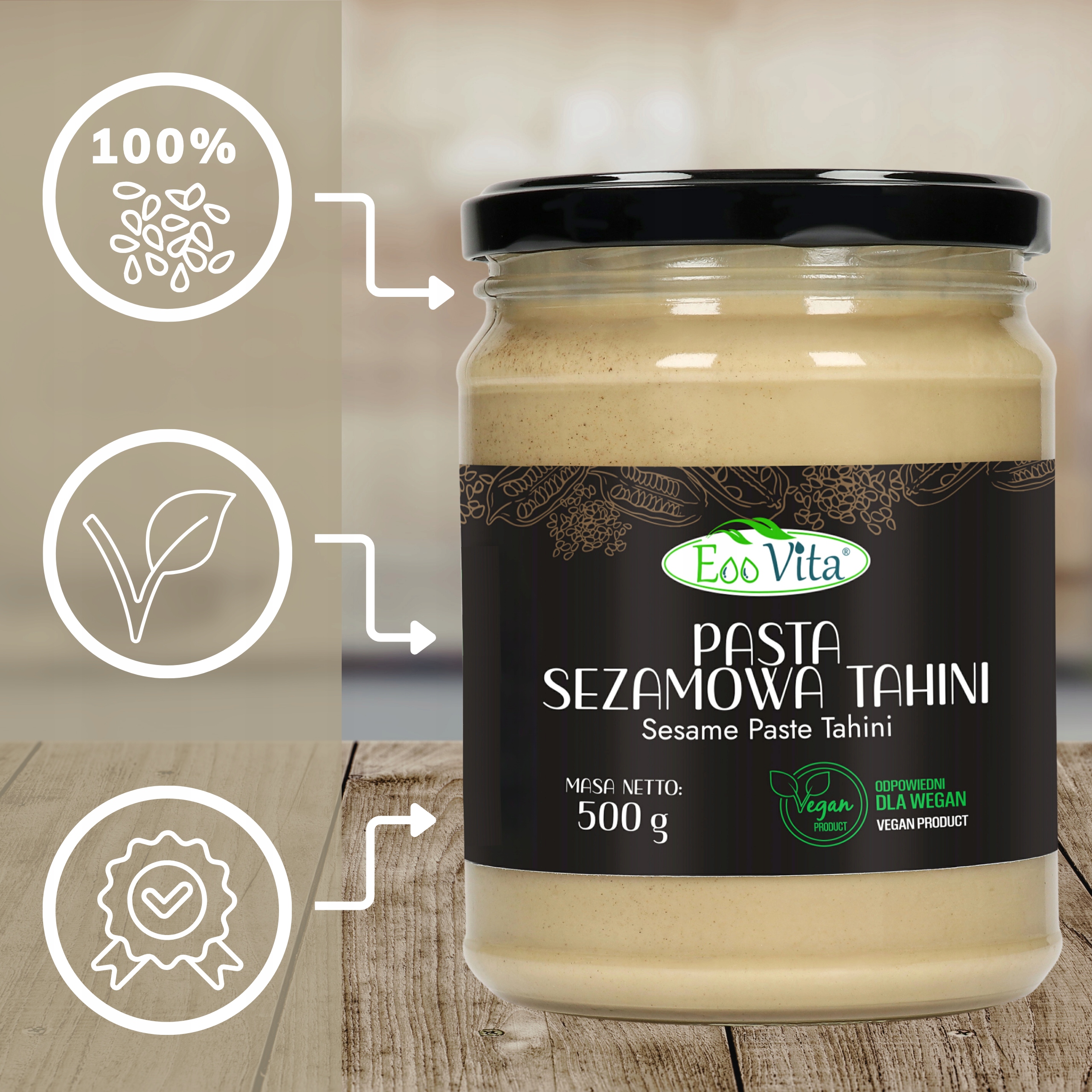 Tahini ma jedwabistą, płynną konsystencję, która w naturalnym procesie może oddzielać się na warstwy – przed użyciem wystarczy dokładnie wymieszać. Jej jasno-beżowy kolor i wyrazisty aromat to efekt dokładnego zmielenia sezamu. Pasta jest w pełni roślinna, co czyni ją odpowiednią dla wegan i osób poszukujących składników do codziennej kuchni.