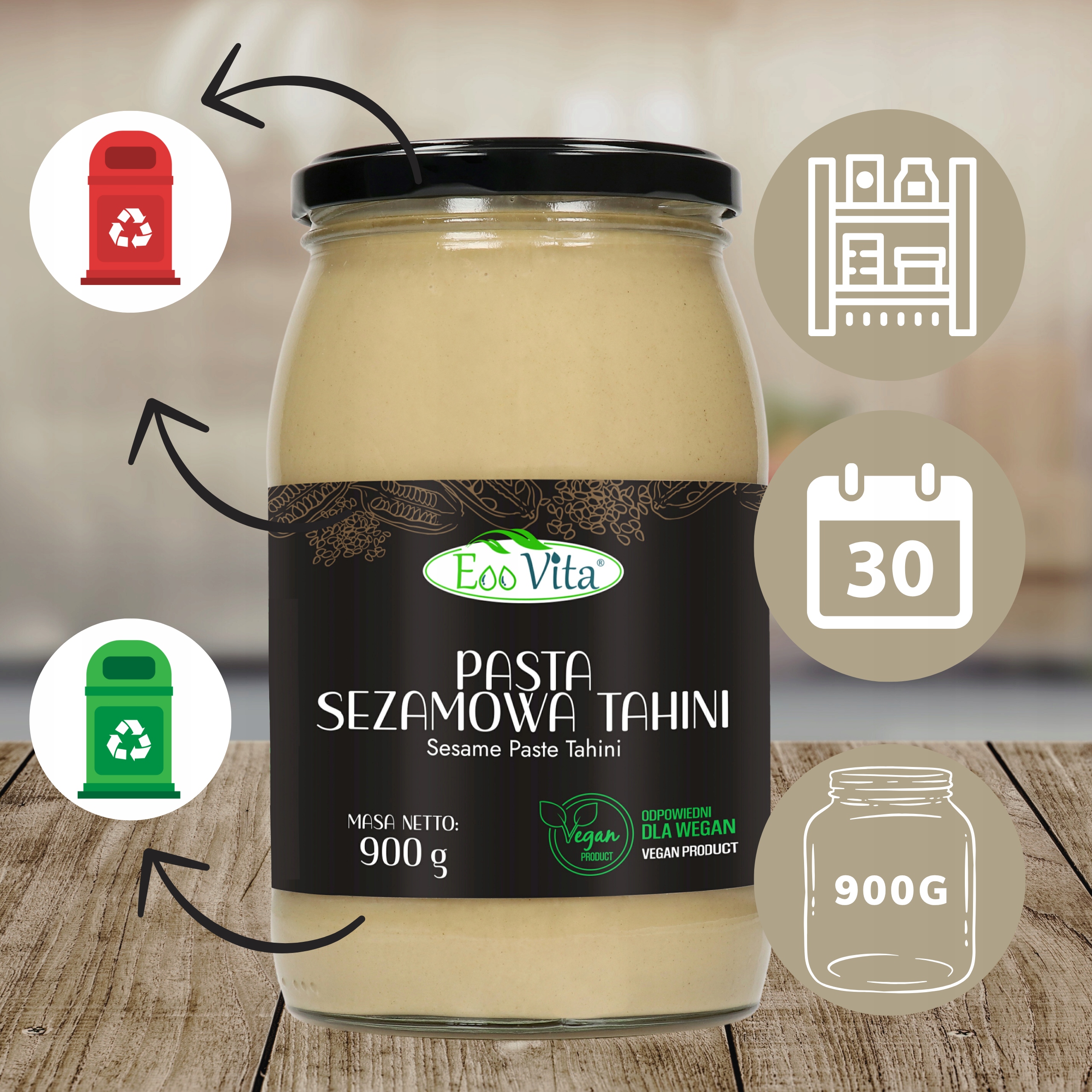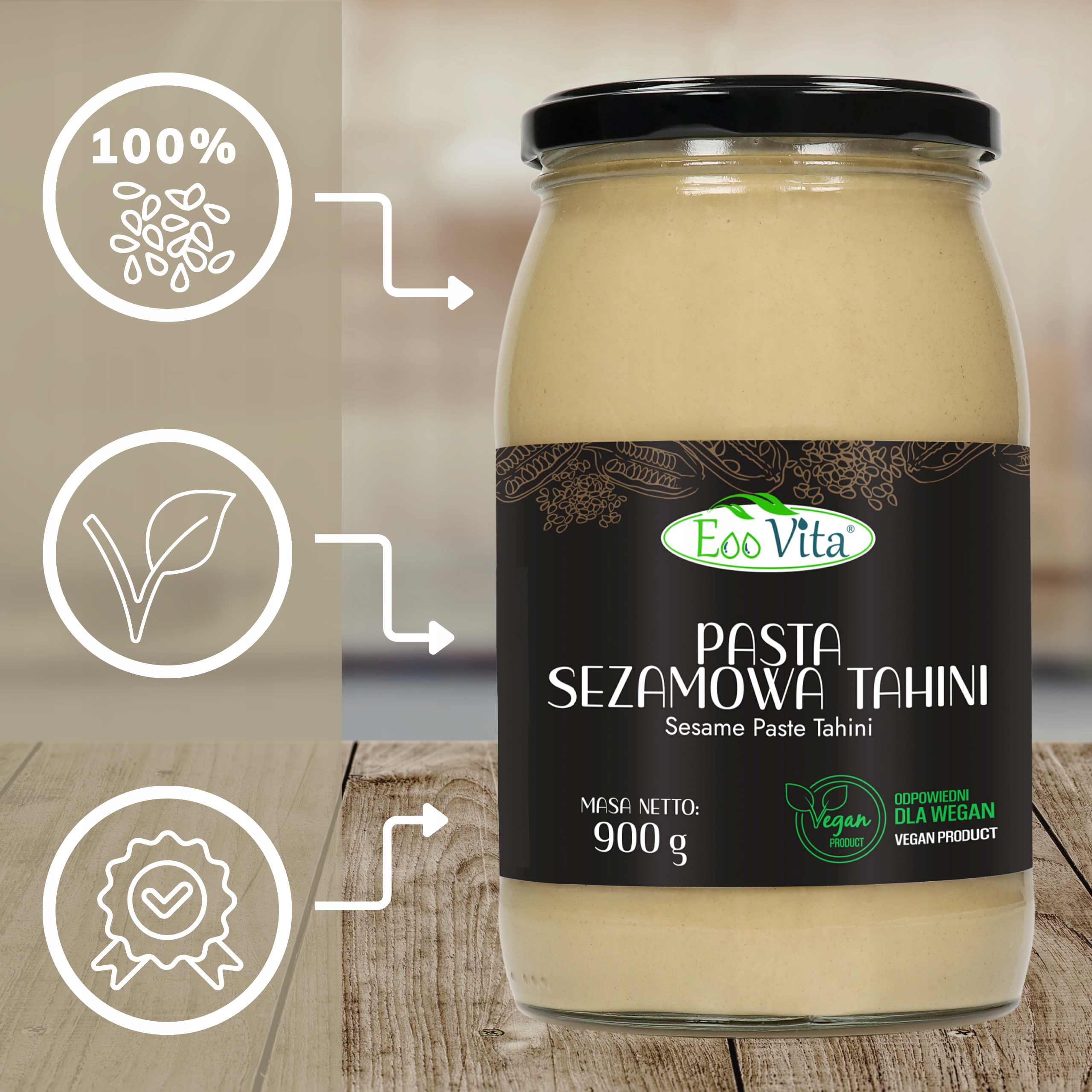 Tahini ma jedwabistą, płynną konsystencję, która w naturalnym procesie może oddzielać się na warstwy – przed użyciem wystarczy dokładnie wymieszać. Jej jasno-beżowy kolor i wyrazisty aromat to efekt dokładnego zmielenia sezamu. Pasta jest w pełni roślinna, co czyni ją odpowiednią dla wegan i osób poszukujących składników do codziennej kuchni.