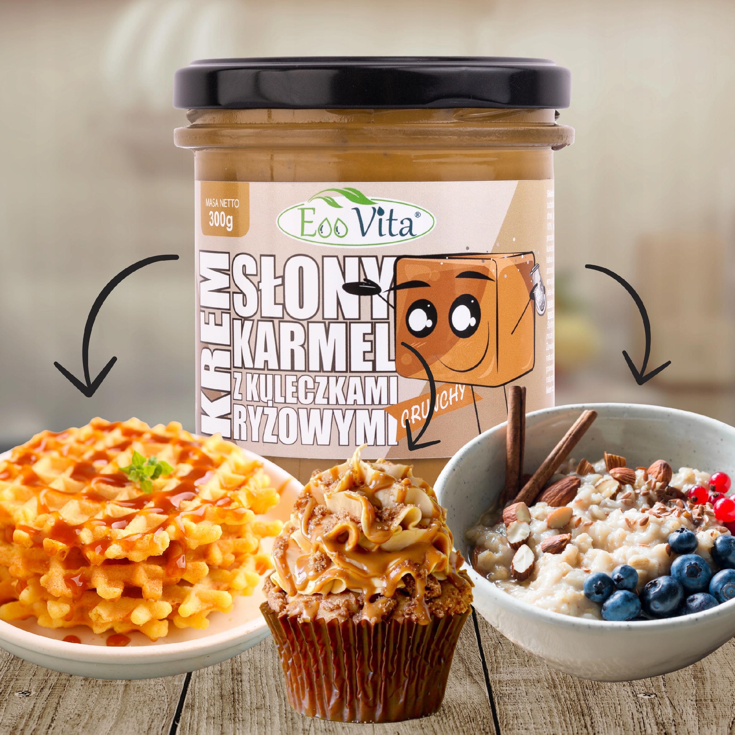 Ten krem to propozycja dla tych, którzy lubią zaskakiwać swoje kubki smakowe nietuzinkowym połączeniem. Delikatna, kremowa baza przełamana została wyrazistym smakiem słonego karmelu oraz dodatkiem kuleczek ryżowych, które wprowadzają chrupiący akcent. Doskonale sprawdzi się jako smarowidło, składnik deserów, dodatek do naleśników czy po prostu przekąska na słodko.
