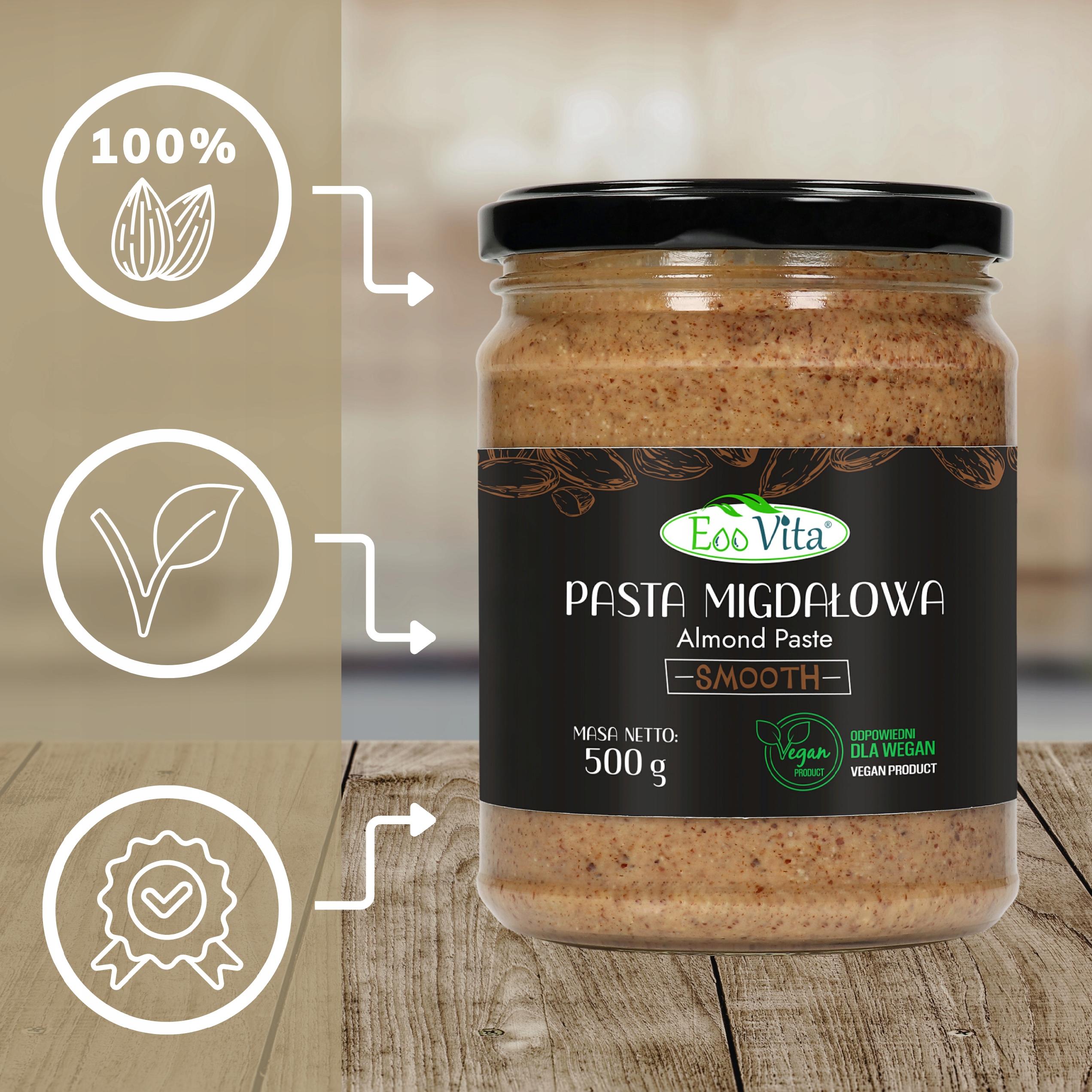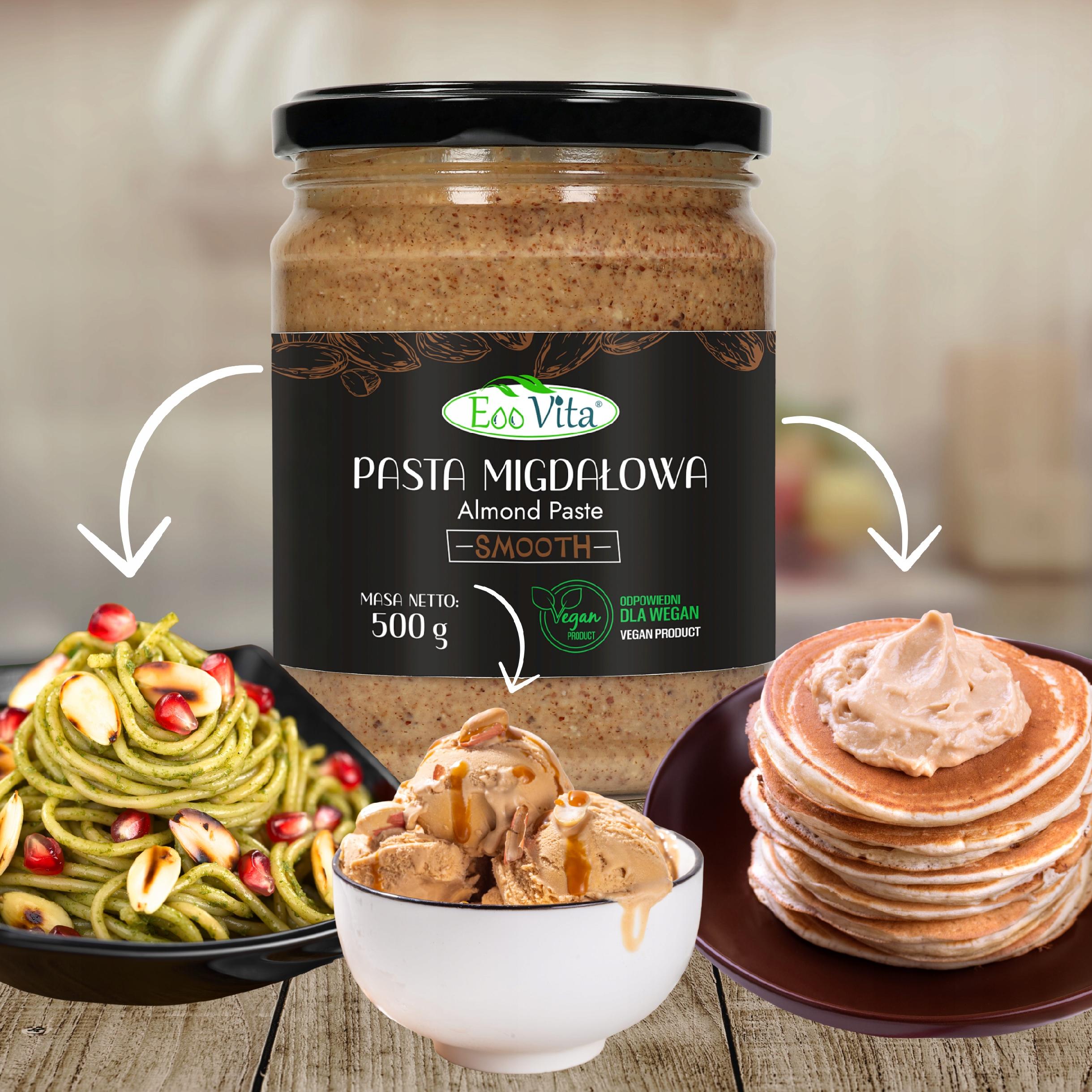 Pasta migdałowa ma lekko brązowy kolor i jedwabistą, płynną strukturę, która łatwo się rozprowadza i łączy z innymi składnikami. Dzięki użyciu nieblanszowanych, prażonych migdałów wyróżnia się intensywnym, wyrazistym smakiem. To forma orzecha, odpowiednia także dla wegan i osób na diecie roślinnej. Jej głęboki aromat doskonale komponuje się zarówno z daniami słodkimi, jak i wytrawnymi. Jej aksamitna konsystencja sprawia, że łatwo się miesza i idealnie rozprowadza nawet na delikatnych powierzchniach, jak pieczywo czy naleśniki.
