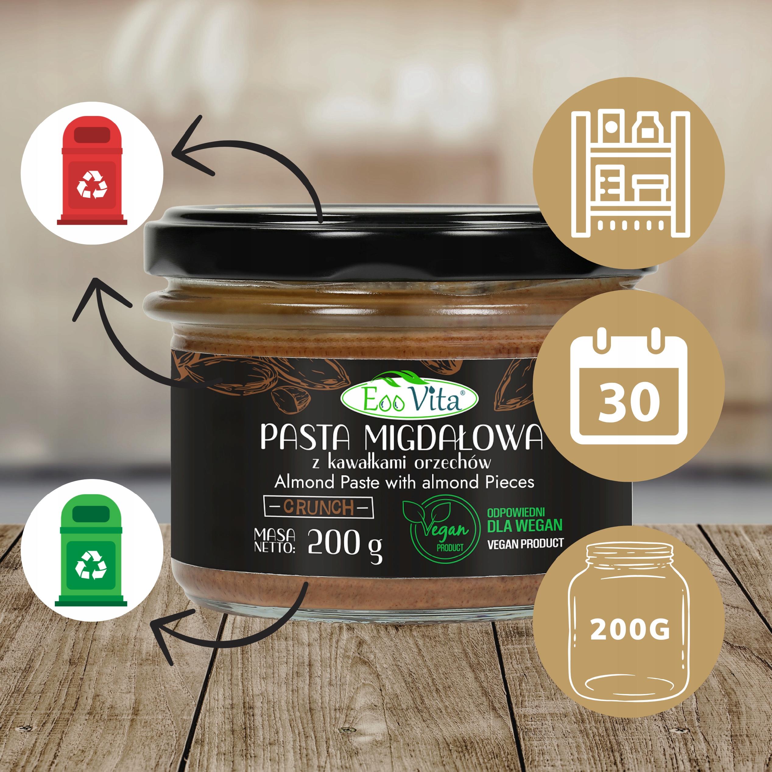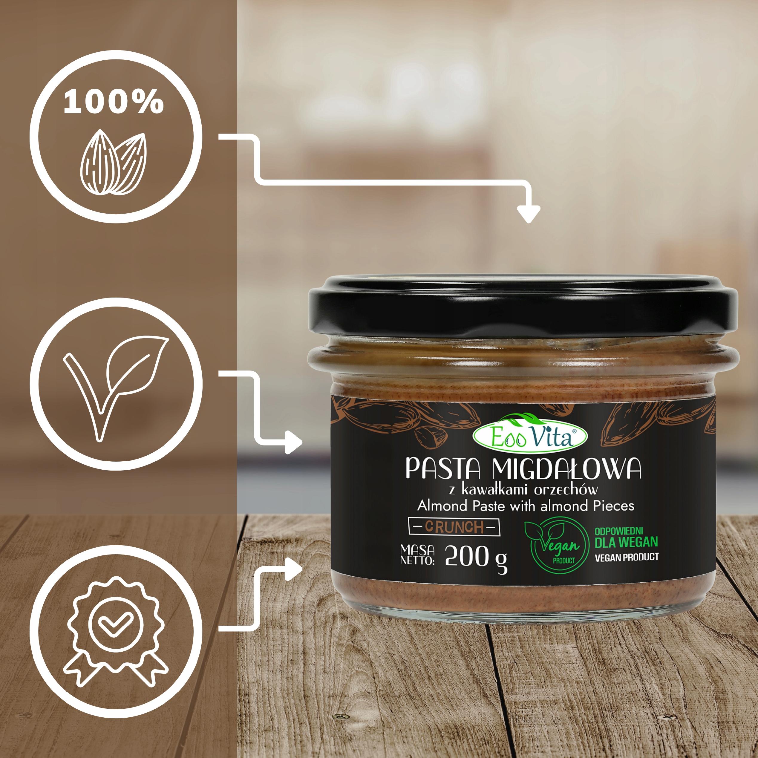- Składniki: 100% migdały nieblanszowane prażone (pasta migdałowa, 10% migdały nieblanszowane prażone kawałki)