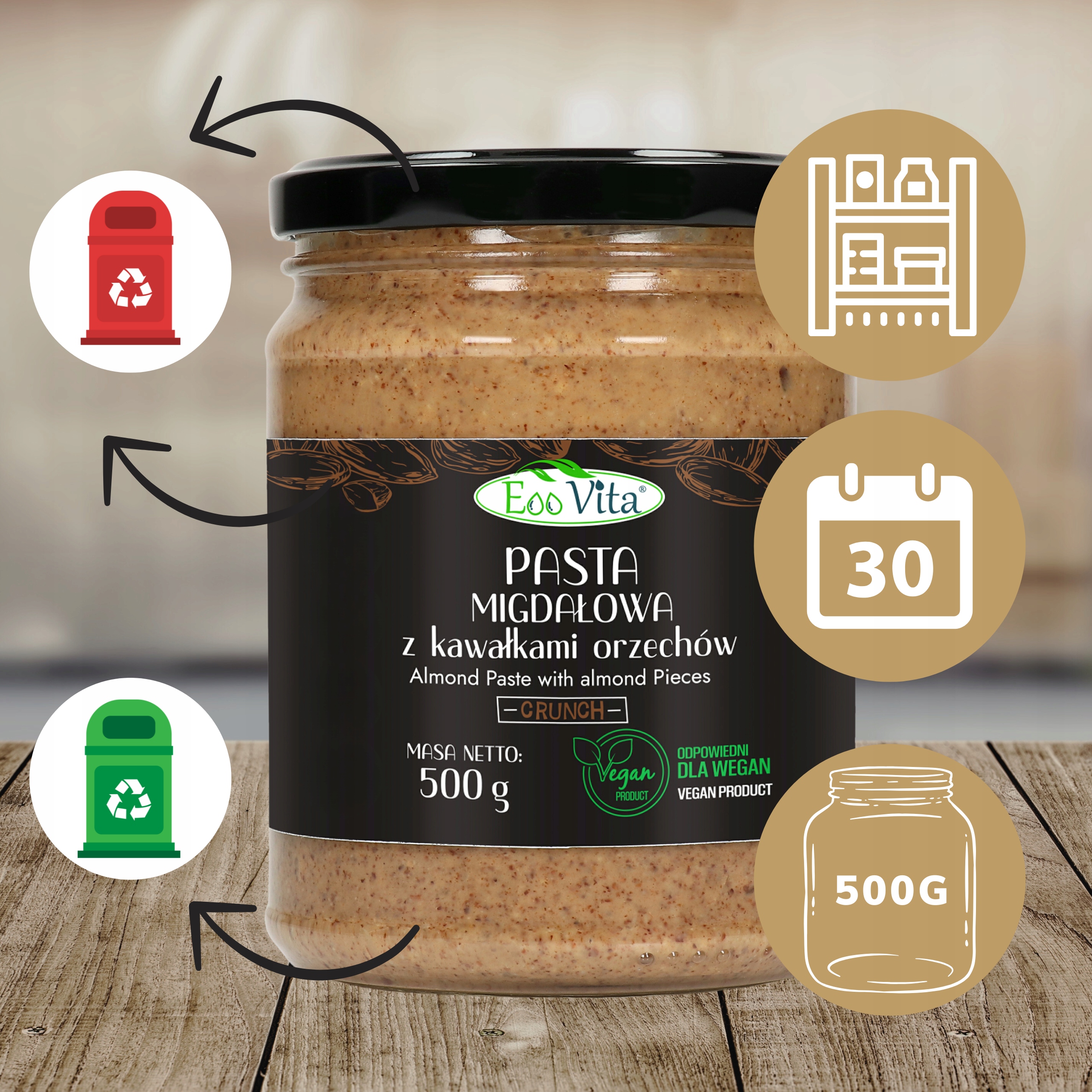 - Składniki: 100% migdały nieblanszowane prażone (pasta migdałowa, 10% migdały nieblanszowane prażone kawałki)