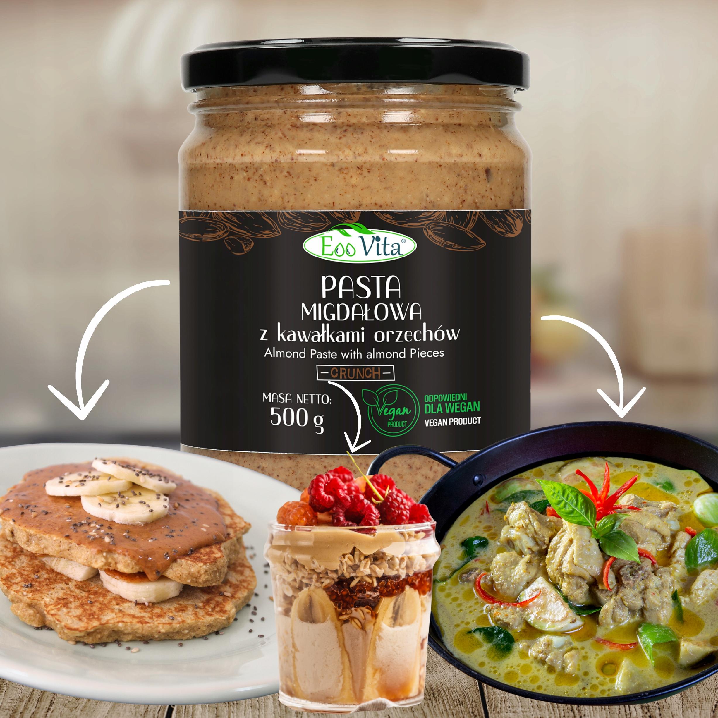 Pasta z kawałkami migdałów to produkt, który odnajdzie się zarówno w prostych śniadaniach, jak i w bardziej złożonych wypiekach. Jej kremowo-chrupiąca konsystencja wzbogaca teksturę potraw i nadaje im orzechowego charakteru.