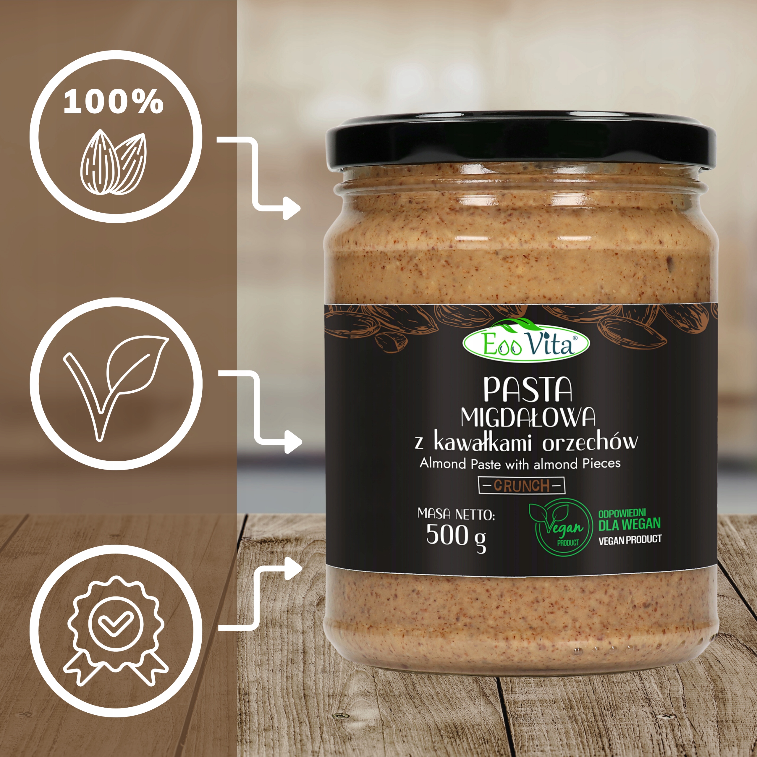 Pasta ma gładką, lekko oleistą konsystencję wzbogaconą o chrupiące kawałki orzechów. Jej jasnobrązowy kolor i głęboki aromat wynikają ze sposobu przygotowania migdałów. Kawałki migdałów nadają jej ciekawej tekstury, dzięki czemu świetnie sprawdzi się zarówno do smarowania, jak i jako składnik mas, kremów czy musli. W razie oddzielenia się oleju na powierzchni wystarczy dokładnie wymieszać pastę przed użyciem. Jest to produkt roślinny, który może być spożywany przez wegan i wegetarian.
