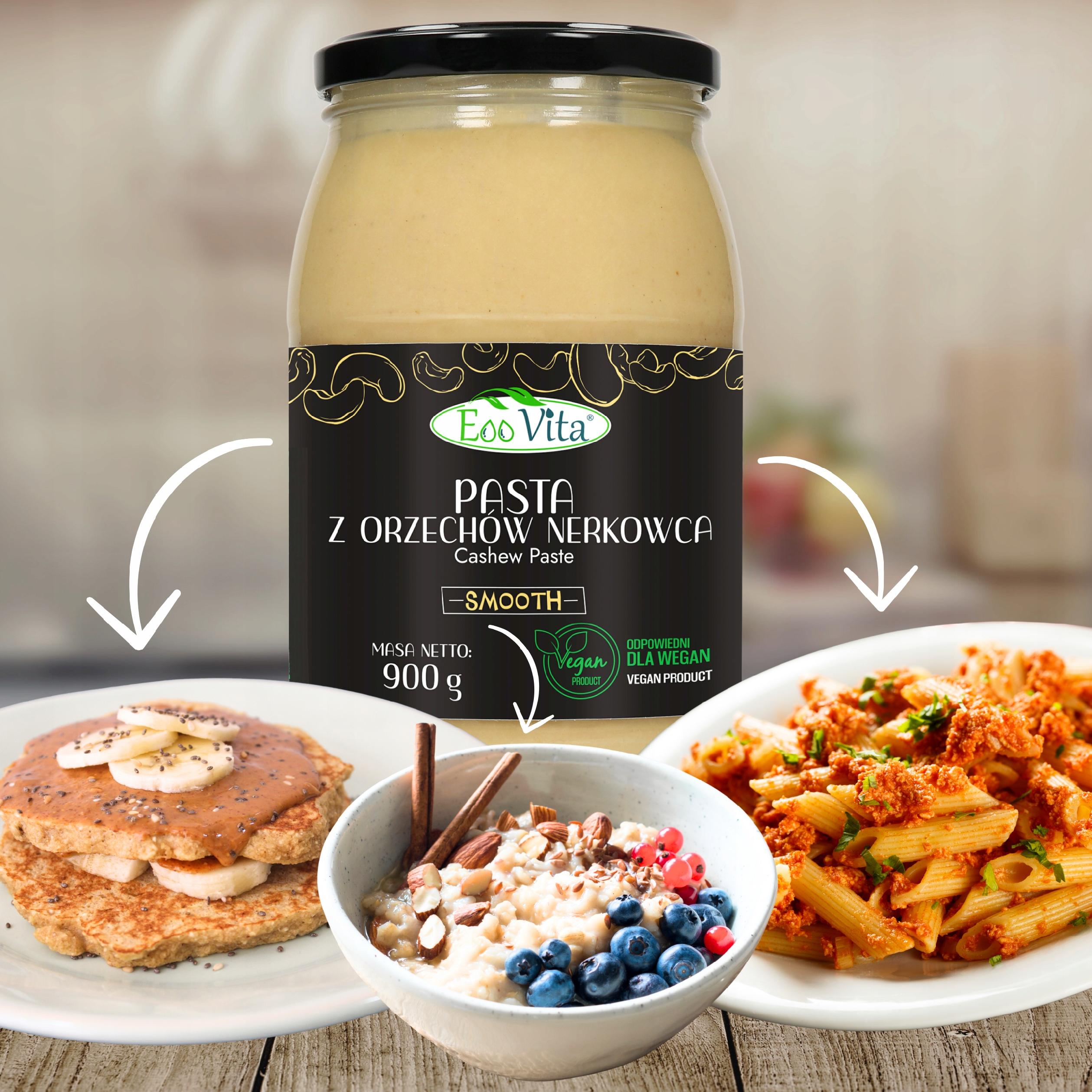 Pasta z orzechów nerkowca ma jasny, kremowy kolor i gładką, aksamitną konsystencję. Naturalnym procesem jest wydzielenie się oleju, który wystarczy wymieszać przed użyciem. Powstaje wyłącznie z prażonych orzechów nerkowca, co nadaje jej delikatnie słodkawy, orzechowy smak. Produkt w 100% roślinny i odpowiedni dla wegan.