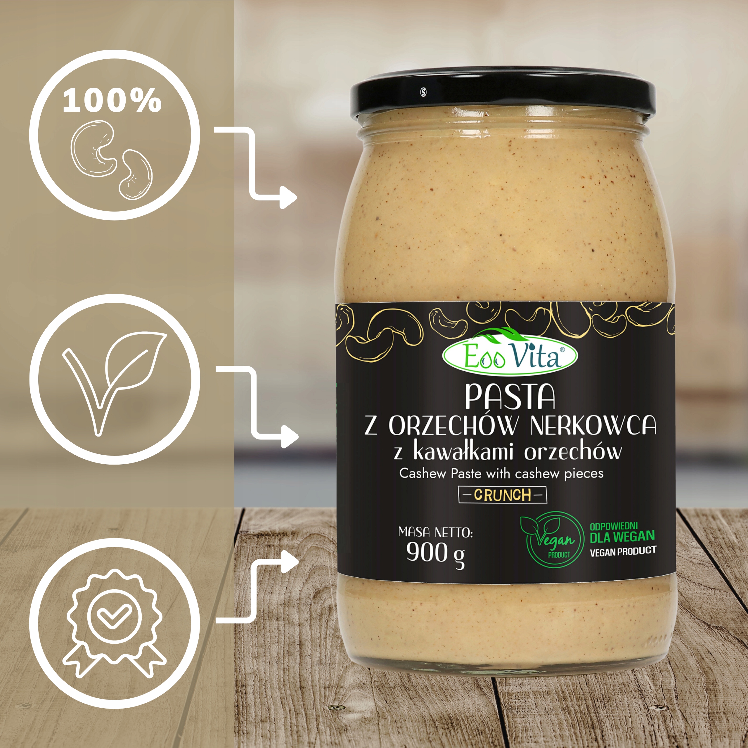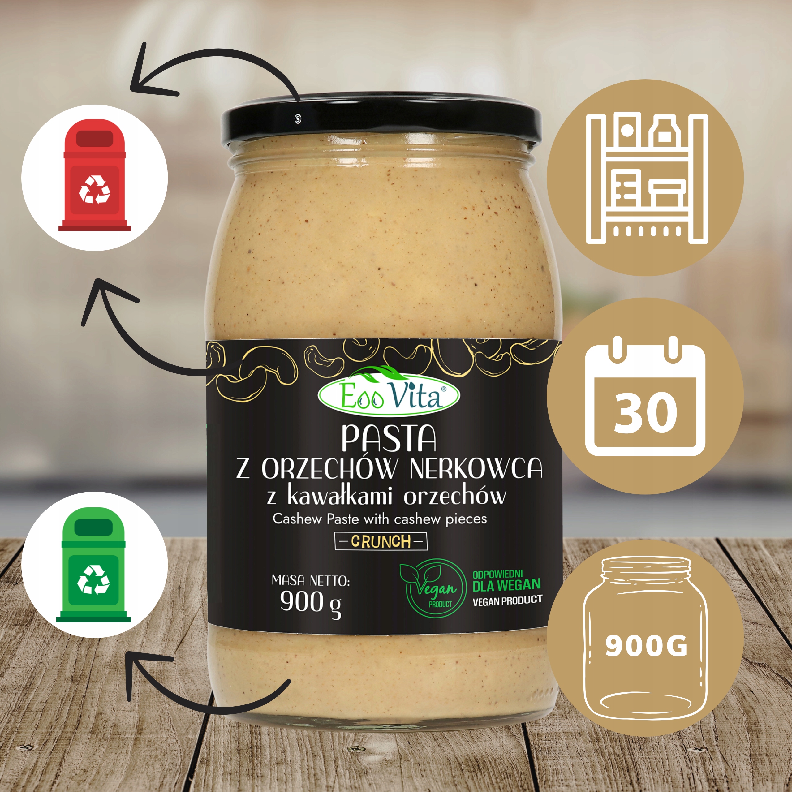- Składniki: 100% orzechy nerkowca (pasta gładka z orzechów nerkowca, 10% orzechy nerkowca prażone kawałki).