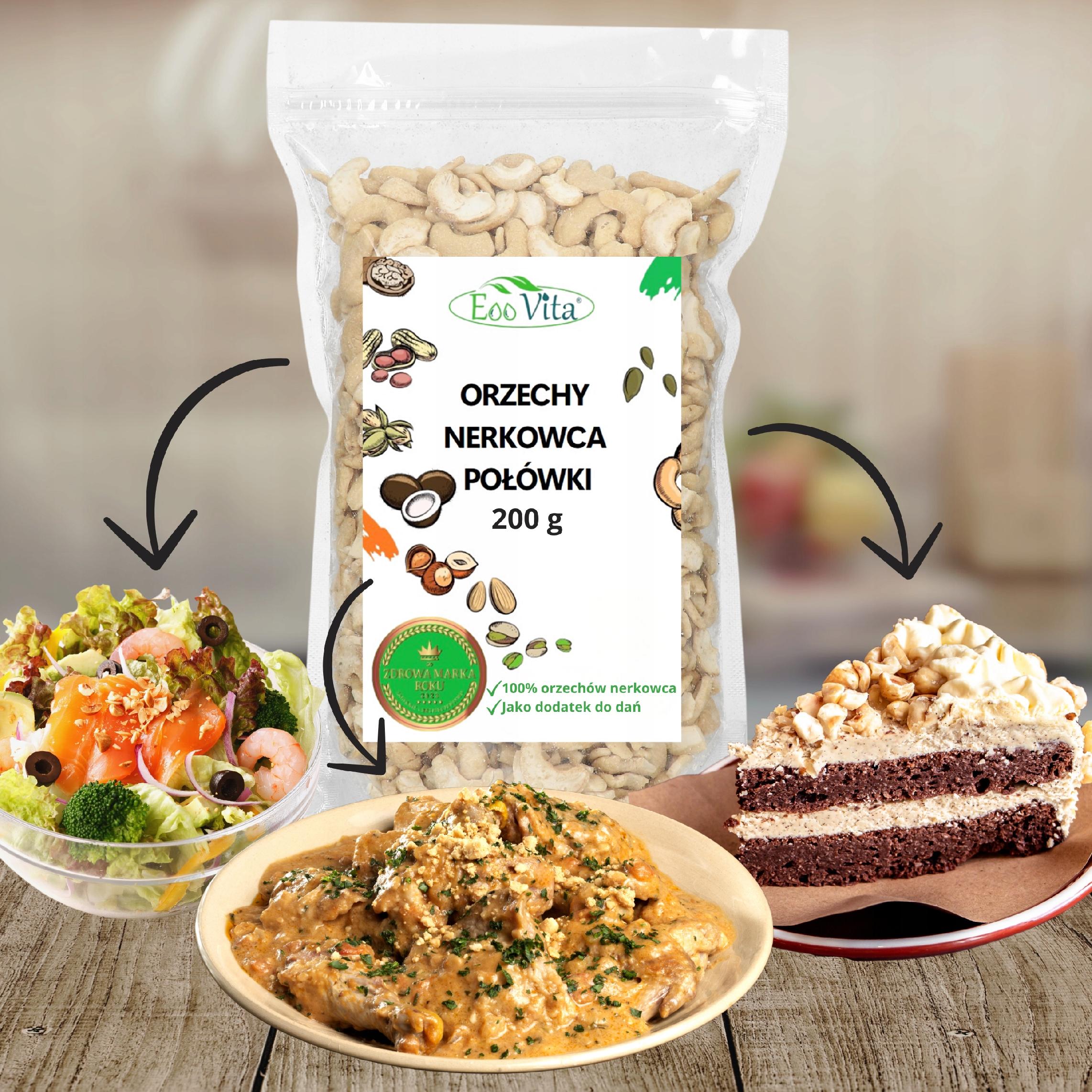 Połówki nerkowców to wszechstronny składnik w kuchni — doskonałe jako przekąska, dodatek do dań, baza kremów lub element dekoracyjny w deserach. Ich delikatny smak świetnie komponuje się zarówno z daniami słodkimi, jak i wytrawnymi.