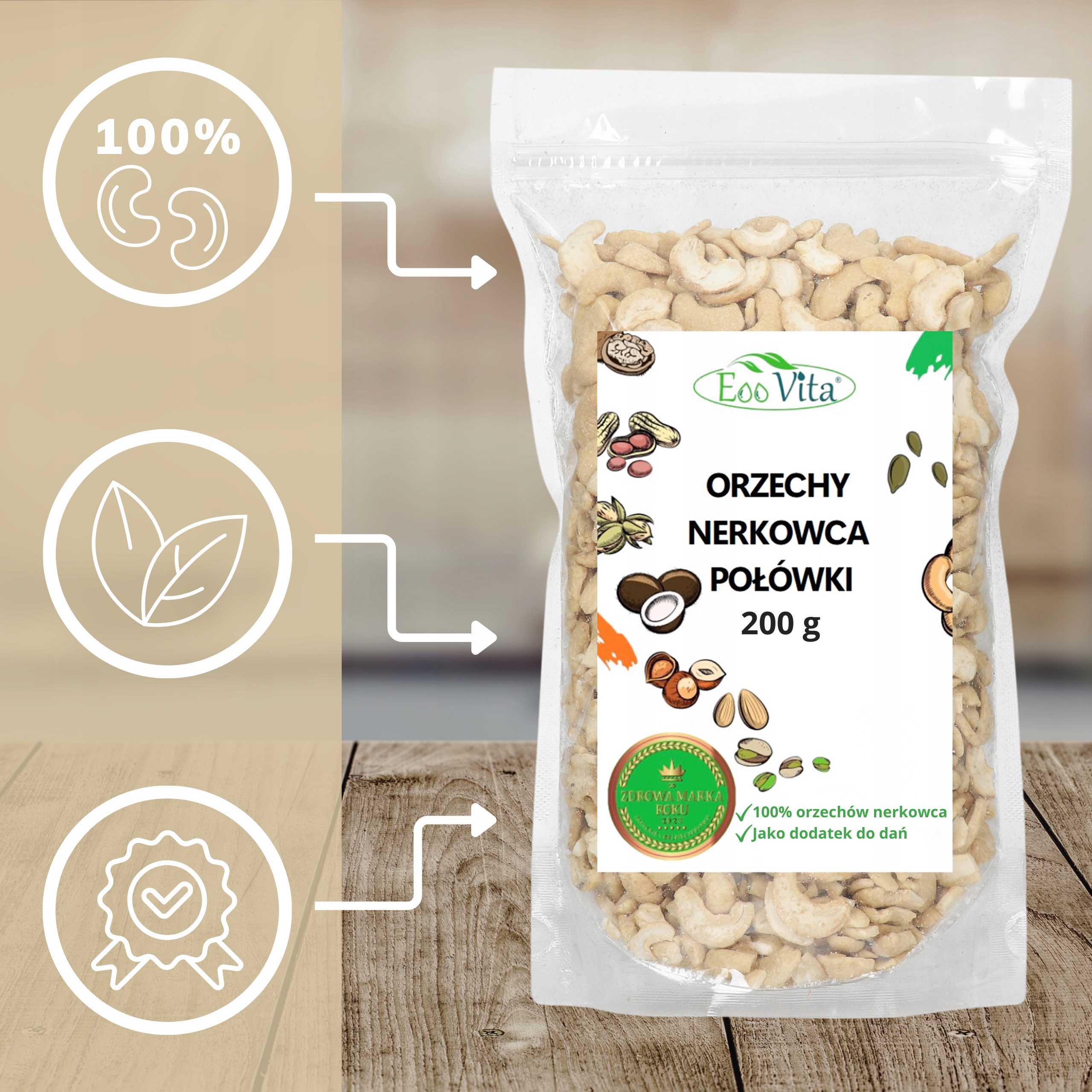 Połówki orzechów nerkowca wyróżniają się jasnym kolorem i gładką, delikatnie zaokrągloną formą. Ich struktura jest chrupiąca, ale jednocześnie miękka w środku, co sprawia, że idealnie nadają się do podprażenia, zmielenia lub użycia w całości. Subtelny smak orzecha w połączeniu z formą połówek dodatkowo ułatwia ich wykorzystanie — są gotowe do użycia bez konieczności krojenia, co czyni je praktycznym i wszechstronnym składnikiem w kuchni.