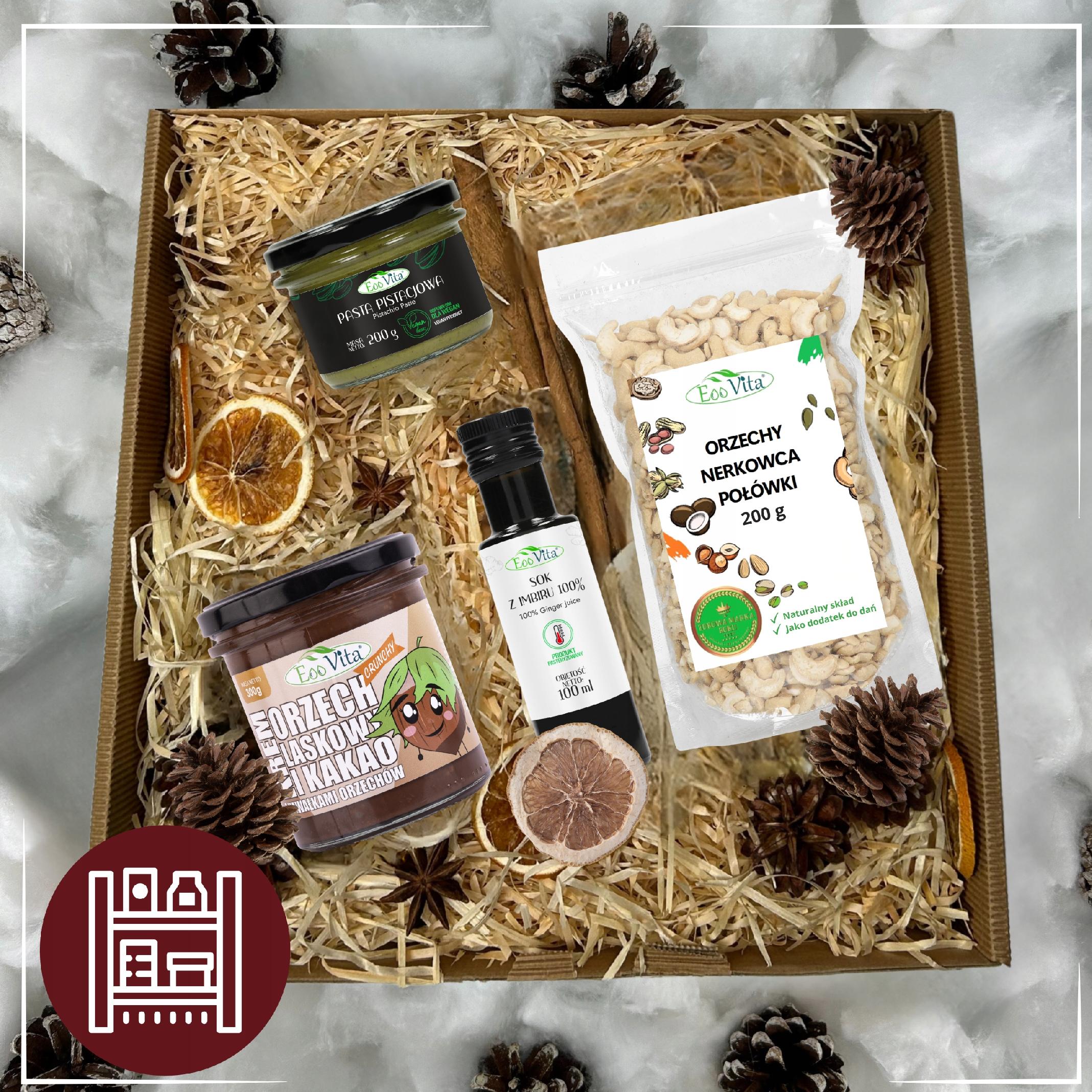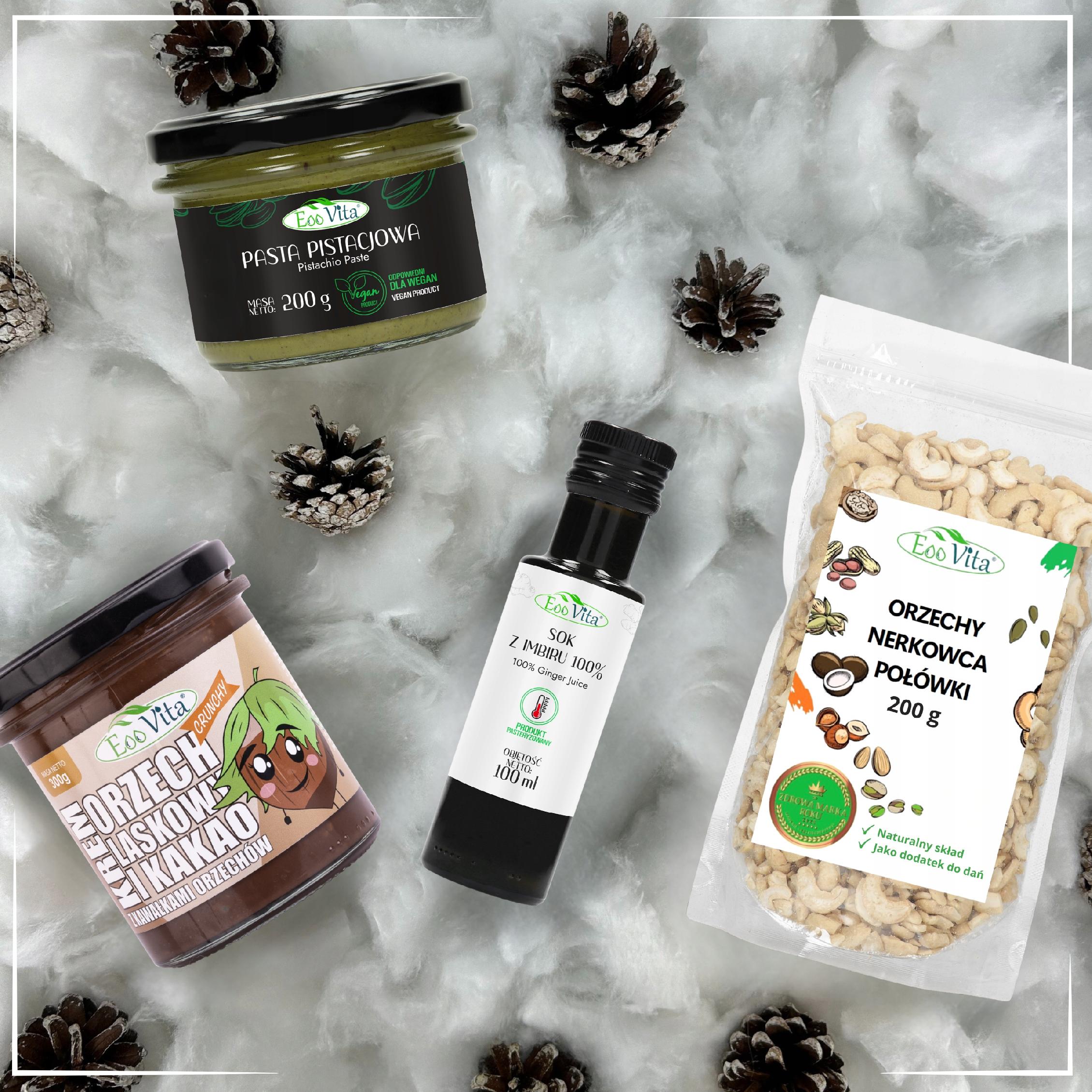 ▶️Zawartość zestawu: krem z pistacji 200 g, sok z imbiru 100 ml, krem orzech laskowy i kakao 300 g, orzechy nerkowca połówki 200 g.